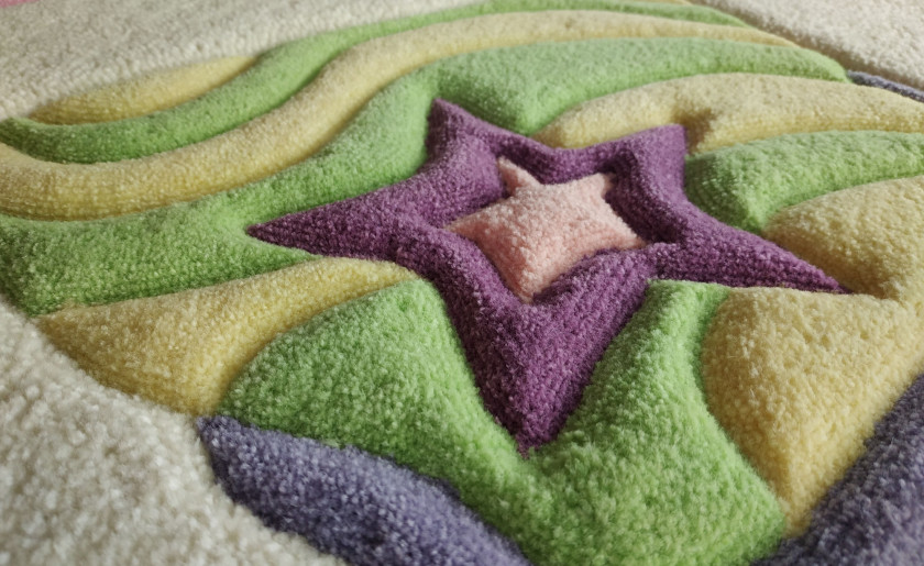 Carpet for Toddlers The design for this toddler carpet was created by Carpet Studio designers specifically for our youngest clients. The combination of bright and muted shades of wool yarn, the correct shapes of the carpet, and the simple elements of the design, as if drawn by a child's hand, convey all the moods of a little one