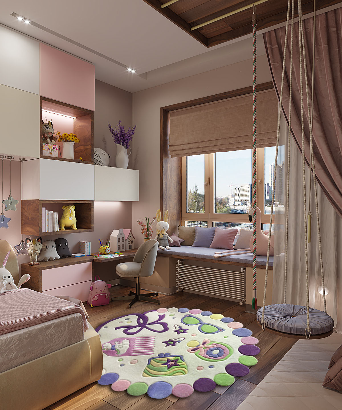 Butterfly-Shaped Carpet for a Girl This irregularly shaped carpet features an incorporated butterfly extending beyond its edges. The irregular shape of the carpet creates a large, warm play area while keeping the carpet's overall size and cost manageable. Made from eco-friendly, natural English wool, the carpet is designed to fit perfectly next to a child's bed with its long side (as shown in the visualization), preventing a child's bare foot from touching a cool floor.