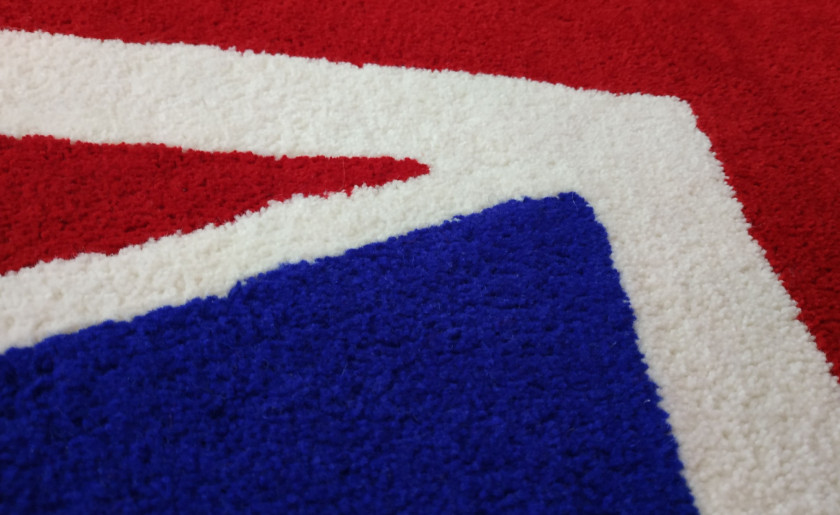 British flag union jack rug This rug, featuring the British flag, has been crafted by the skilled artisans at the Carpet Studio using natural British wool. It adheres to the correct proportion of the Union Jack, with a width-to-length ratio of 1:2, unlike the 1:1.5 ratio commonly found in other national flags.