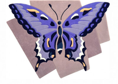Butterfly-Shaped Carpet for a Girl This irregularly shaped carpet features an incorporated butterfly extending beyond its edges. The irregular shape of the carpet creates a large, warm play area while keeping the carpet's overall size and cost manageable. Made from eco-friendly, natural English wool, the carpet is designed to fit perfectly next to a child's bed with its long side (as shown in the visualization), preventing a child's bare foot from touching a cool floor.
