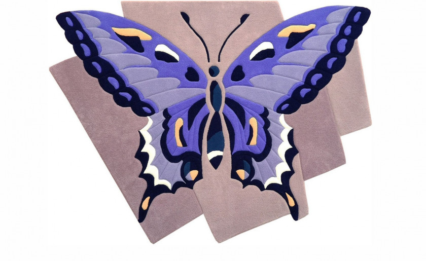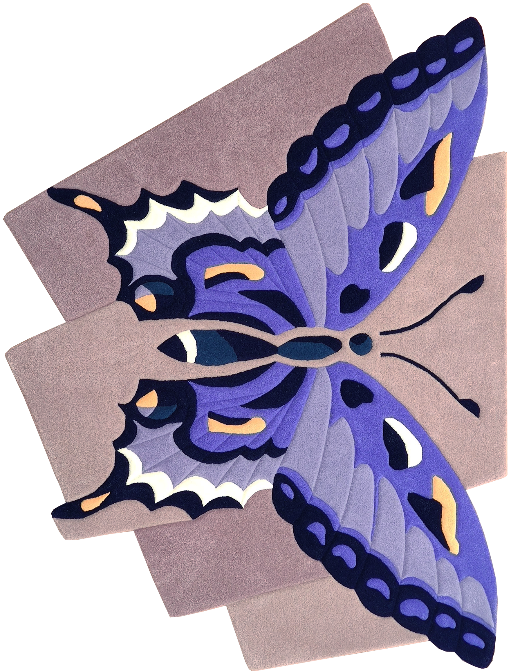 Butterfly-Shaped Carpet for a Girl This irregularly shaped carpet features an incorporated butterfly extending beyond its edges. The irregular shape of the carpet creates a large, warm play area while keeping the carpet's overall size and cost manageable. Made from eco-friendly, natural English wool, the carpet is designed to fit perfectly next to a child's bed with its long side (as shown in the visualization), preventing a child's bare foot from touching a cool floor.