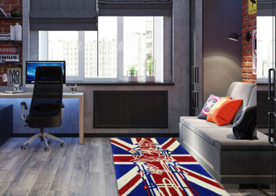 British flag union jack rug This rug, featuring the British flag, has been crafted by the skilled artisans at the Carpet Studio using natural British wool. It adheres to the correct proportion of the Union Jack, with a width-to-length ratio of 1:2, unlike the 1:1.5 ratio commonly found in other national flags.