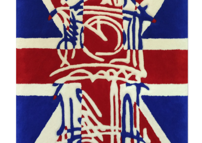 British Flag Rug with Big Ben The clock tower of Westminster Abbey (Big Ben) is depicted by the designers of the "Carpet Studio" against the backdrop of the British flag. The outline of Big Ben is rendered in an abstract style, using a "sketch" technique reminiscent of late 19th-century impressionist sketches. The image is created with a reverse color scheme, with the silhouette further emphasized by hand-cut details.