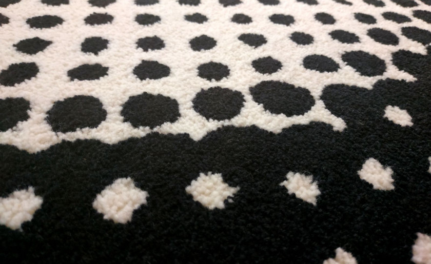 This rectangular carpet features irregular edges that follow the outlines of small black and white flowers scattered across the background.