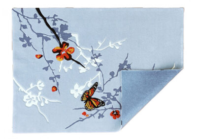 The carpet design was created by the designers of the Carpet Studio, inspired by a photo of artistic textured plaster on Pinterest (link to our Pinterest channel). This is yet another idea for carpet design. To give the carpet a sculptural quality, two different textures and three pile heights were used. The neutral gray background is made with a calm gray color using a cut loop with a pile height of 12mm, as well as the white branches and flowers of the sakura. These are separated only by a relief cut along the edges of the outline. The dark gray and black sakura branches have a different texture – an uncut loop (boucle) with a height of 10mm, which pushes these elements into the background. On the foreground, a bright butterfly and several multicolored sakura flowers stand out, made with a cut loop pile height of 18mm. The design of the carpet is concise and fully complete. This carpet is an ideal solution for both the living room and the bedroom.