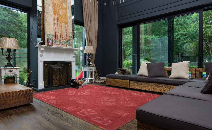 The rug’s design uses two textures — looped and sheared wool — and three pile heights to achieve a sculptural 3D effect. The interplay between matte and sheen areas in a single color creates a subtle yet powerful visual impact.