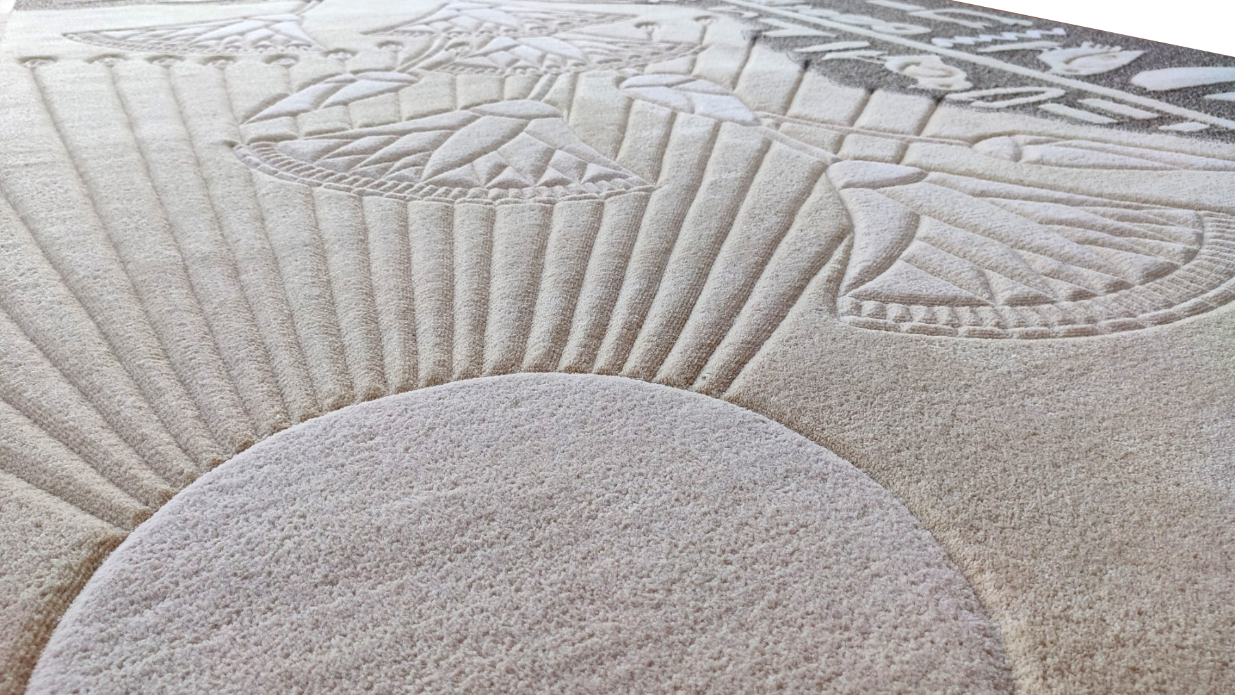 The main section of the rug is crafted using V-tuft cut pile with intricate hand carving depicting the sun – as it might have been envisioned by the Pharaohs themselves. The palette is kept in two soft beige tones, as if faded by centuries of scorching desert sunlight.