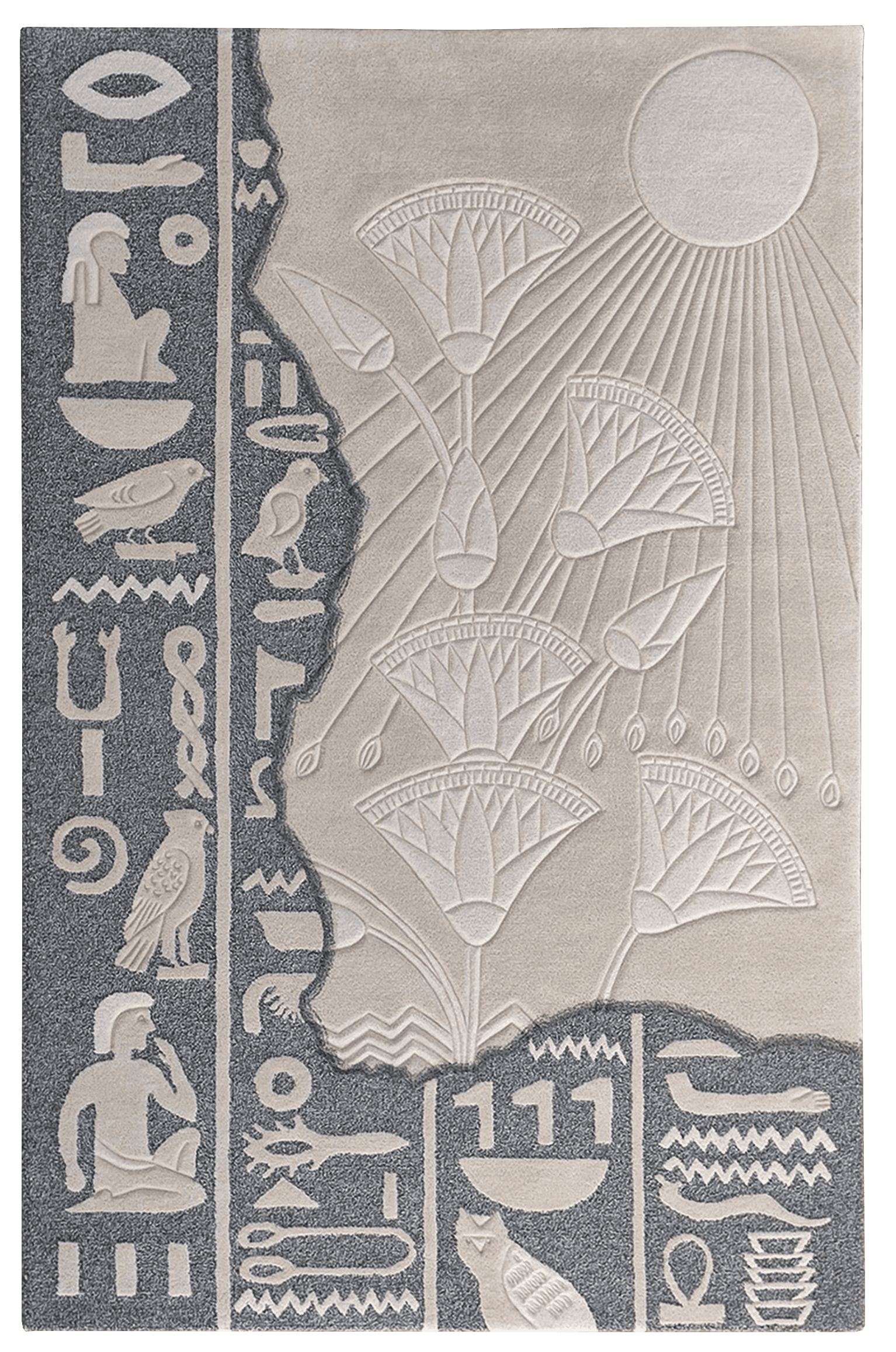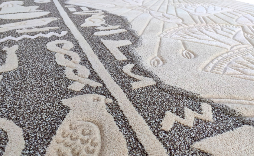 The design was developed by our Carpet Studio based on a bas-relief fragment from ancient Egyptian wall décor. The loop pile section mimics weathered stone etched with ancient hieroglyphics. This effect is achieved with exclusive British yarn twisted from three differently colored threads, creating the look of aged sandstone.