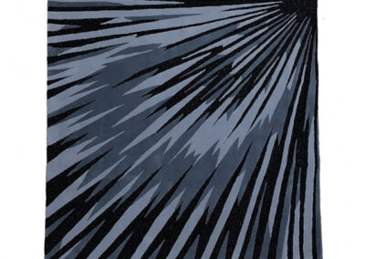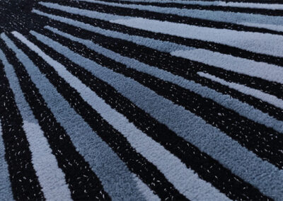 This carpet is made from the highest quality materials – British wool and metallic thread woven into one of the carpet’s textures, boucle. The carpet is designed in a dark color palette, making it perfect for many contemporary interiors (loft, high-tech, minimalism, and others). The modern design of the carpet is highlighted by the dynamic pattern of lines converging at a corner point and the multiple transitions of yarn shades – from neutral gray to black. The metallic thread in black and silver, woven into the boucle texture (uncut loop), adds a special touch. The back of the carpet is reinforced with an additional felt layer.