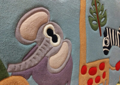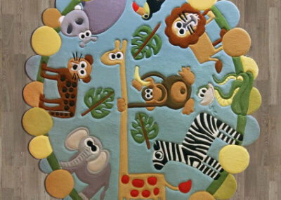 Bright, stylized animals, as if they have just stepped out of a cartoon, are scattered across this carpet. An elephant, lion, zebra, leopard, hippopotamus, cockatoo, python, and of course, a mischievous monkey hugging a long-necked giraffe. All these animals will become your child’s best friends, fostering a love for our animal companions.