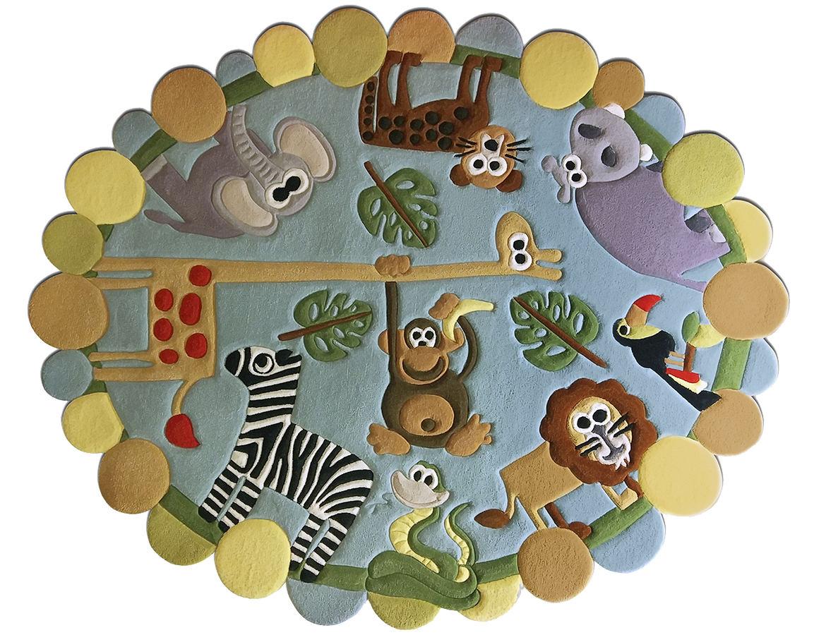 Bright, stylized animals, as if they have just stepped out of a cartoon, are scattered across this carpet. An elephant, lion, zebra, leopard, hippopotamus, cockatoo, python, and of course, a mischievous monkey hugging a long-necked giraffe. All these animals will become your child’s best friends, fostering a love for our animal companions.