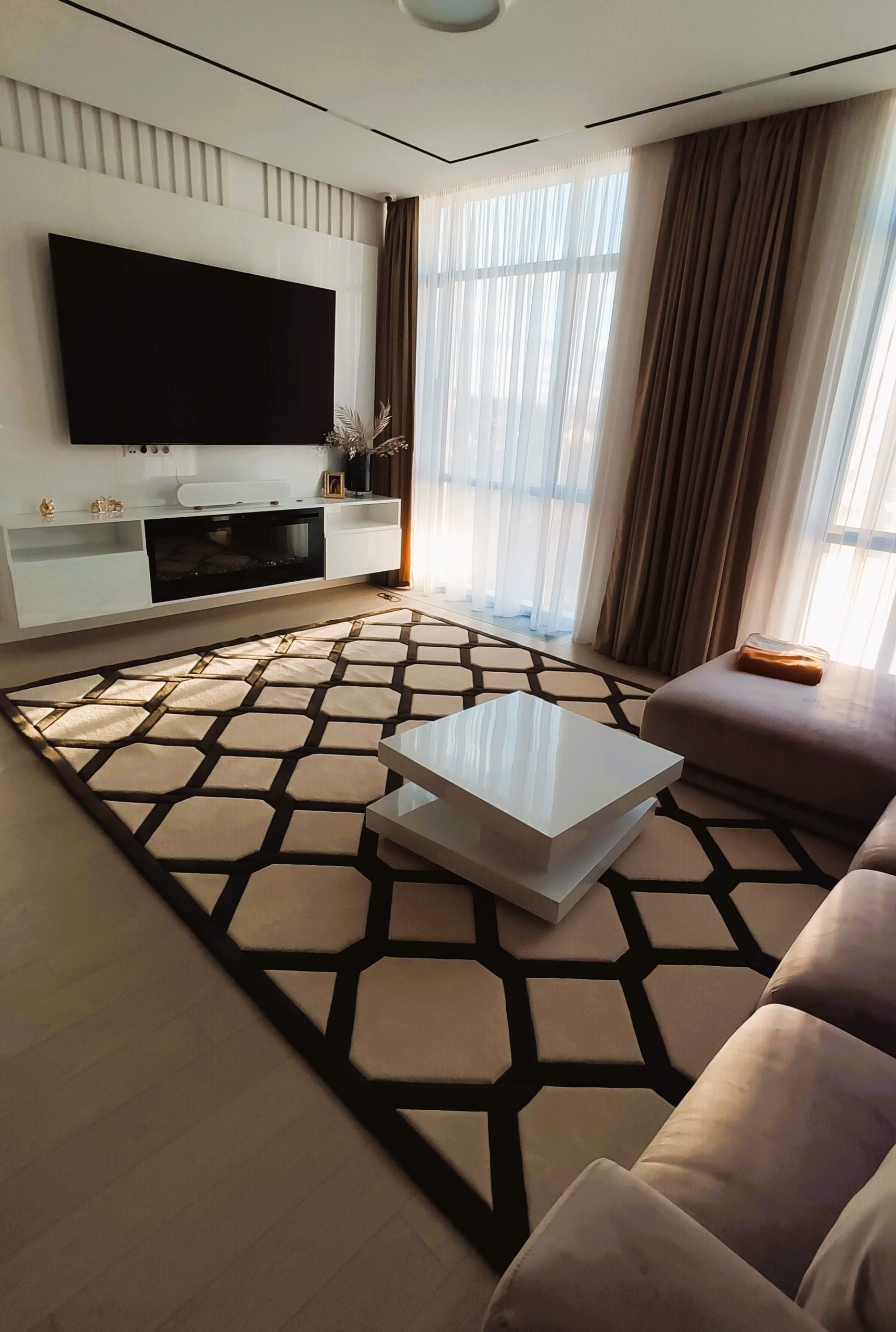 Every line of this rug was tufted and carved with millimeter precision. The sculpted pile highlights the geometric design, playing beautifully with natural and artificial light in the interior. The rug became a true centerpiece of the living room.