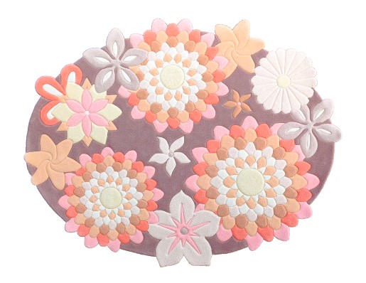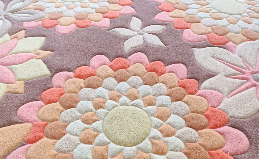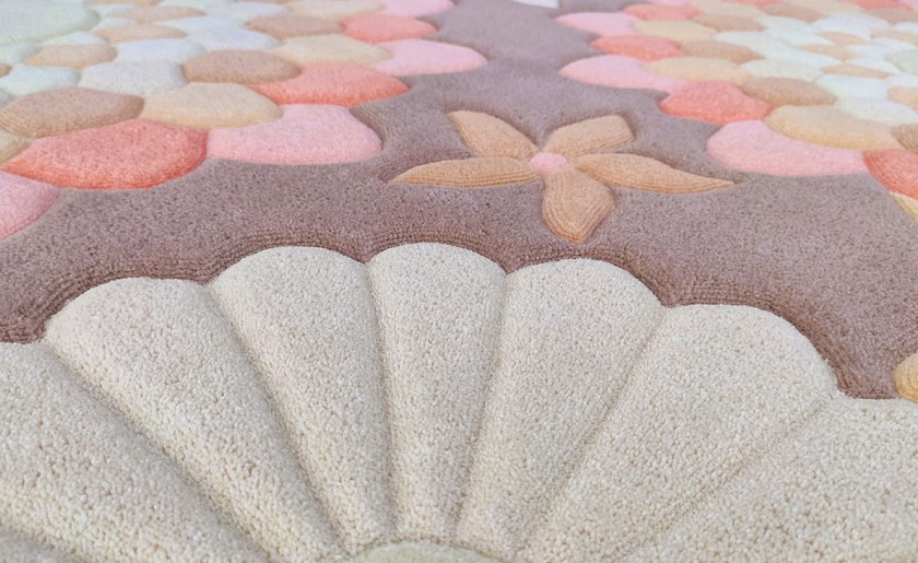 . По границам узора выполнена рельефная стрижка, которая добавляет ковру объем, подчеркивая форму лепестков и плавные линии овала.